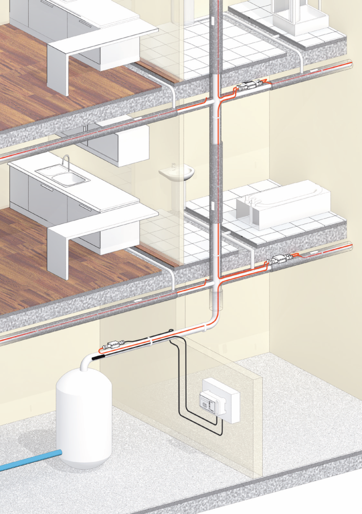 Grijaći kabel montiran na jednostruku cijev za toplu vodu održava vodu na željenoj temperaturi.